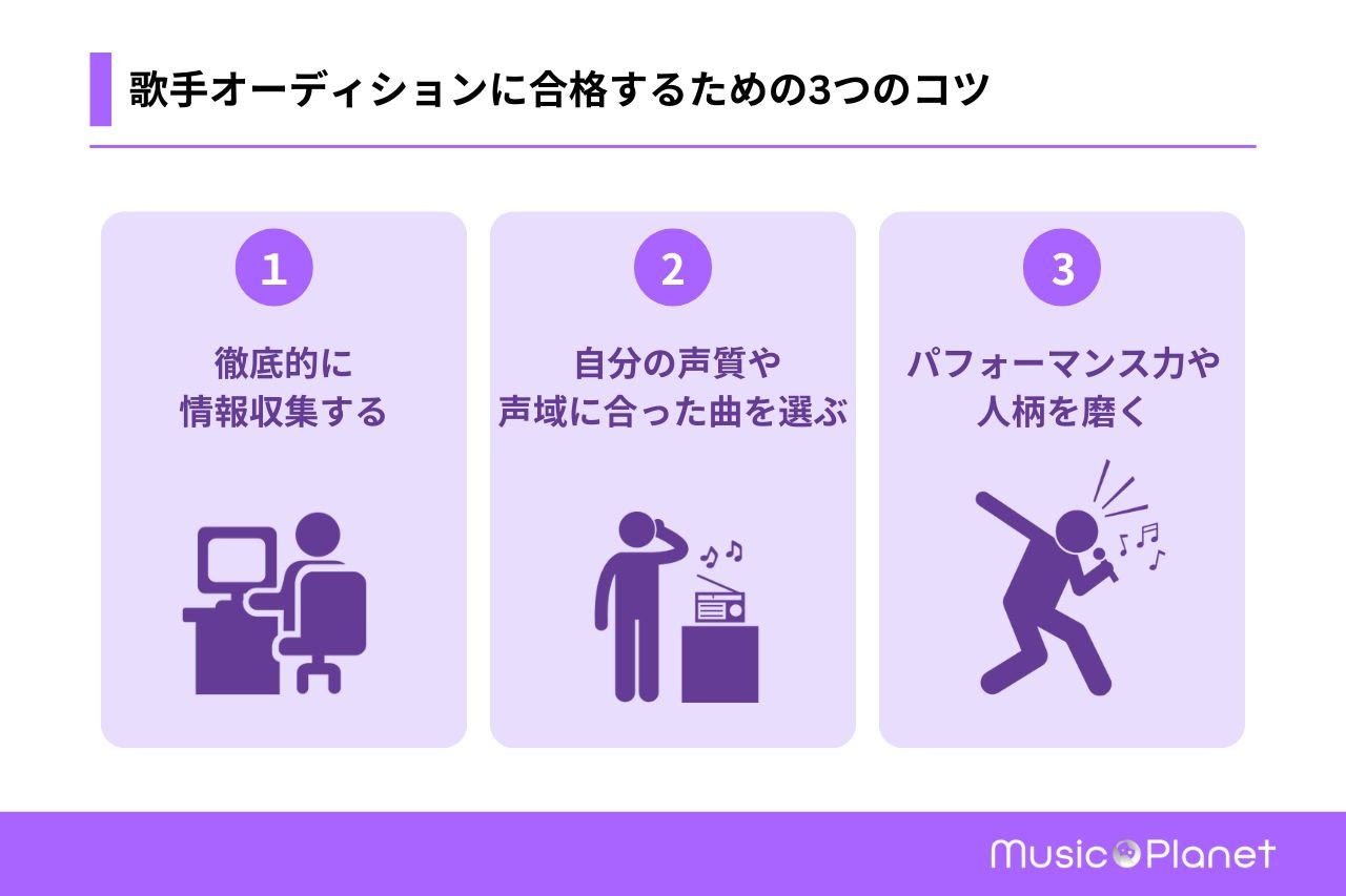 歌手オーディションに合格するためには、次の3つのポイントを押さえておきましょう。